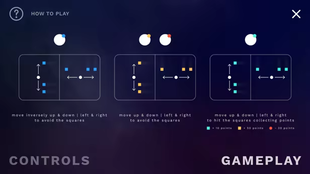 The game is so easy to control but moving the 2 circles at the same time by moving the circle horizontally on the left and vertically on the right, might be challenging as you play through the game, the incoming squares are going to move faster.