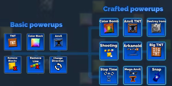 In 3x64 you can get many types of powerups. You have 3 slots for basic powerups - these can be easily earned by destroying active color blocks. Then you can use them whenever you want, or you can wait and craft much more powerful ones - the choice is yours!