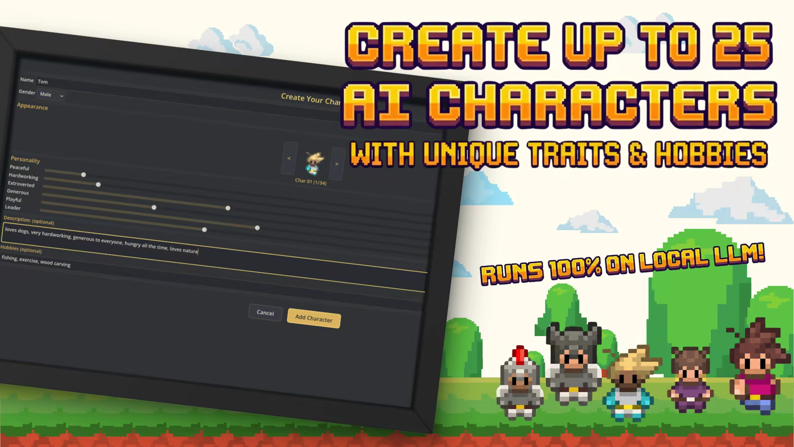 Every conversation, every social media post, every decision your townsfolk make is generated live by the AI model you select.