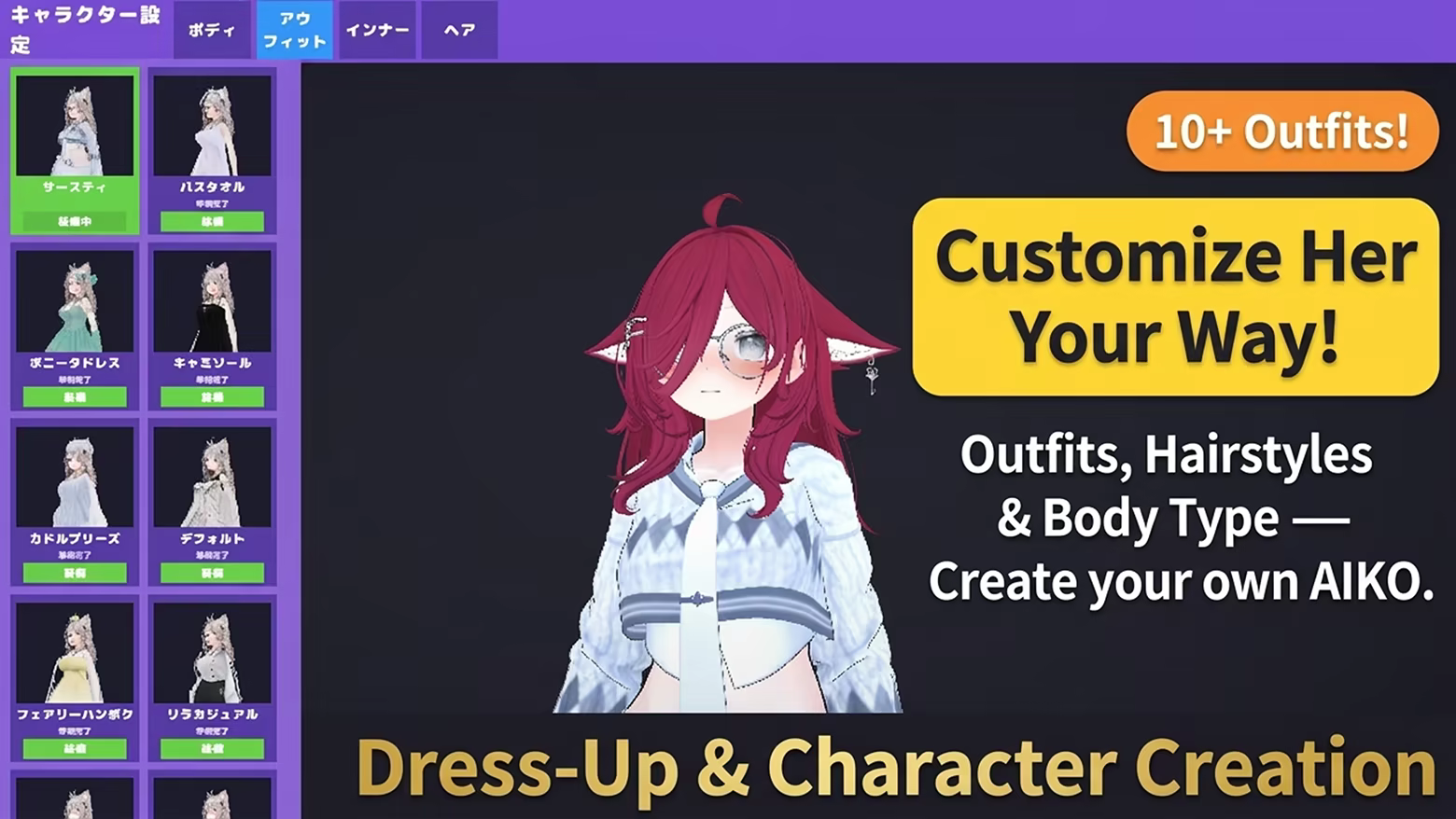 10+ outfits, inners/lingerie, hairstyles, eye colors, body type. Make her yours.