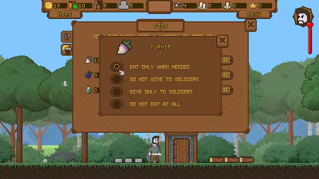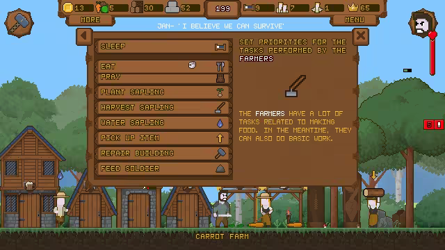 The player can hire employees to perform various jobs. However, the employee has needs. The employee may be hungry and crave specific food. The worker must have a place to sleep and may need to pray to a desired god.