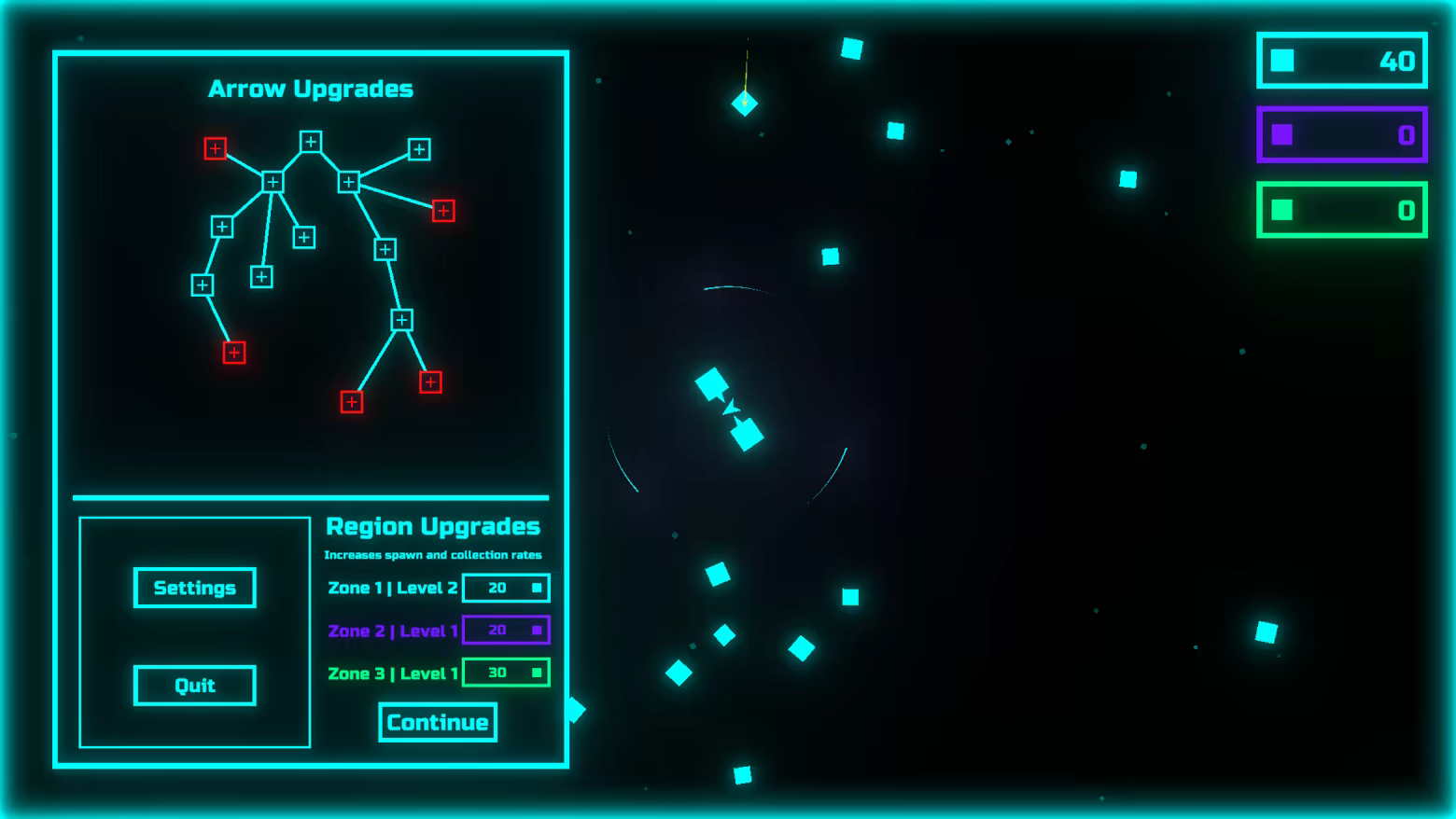 Collect squares that spawn around the map by destroying them using your upgrades.