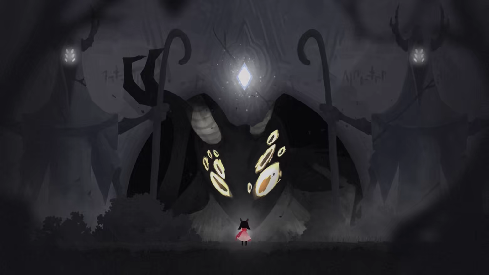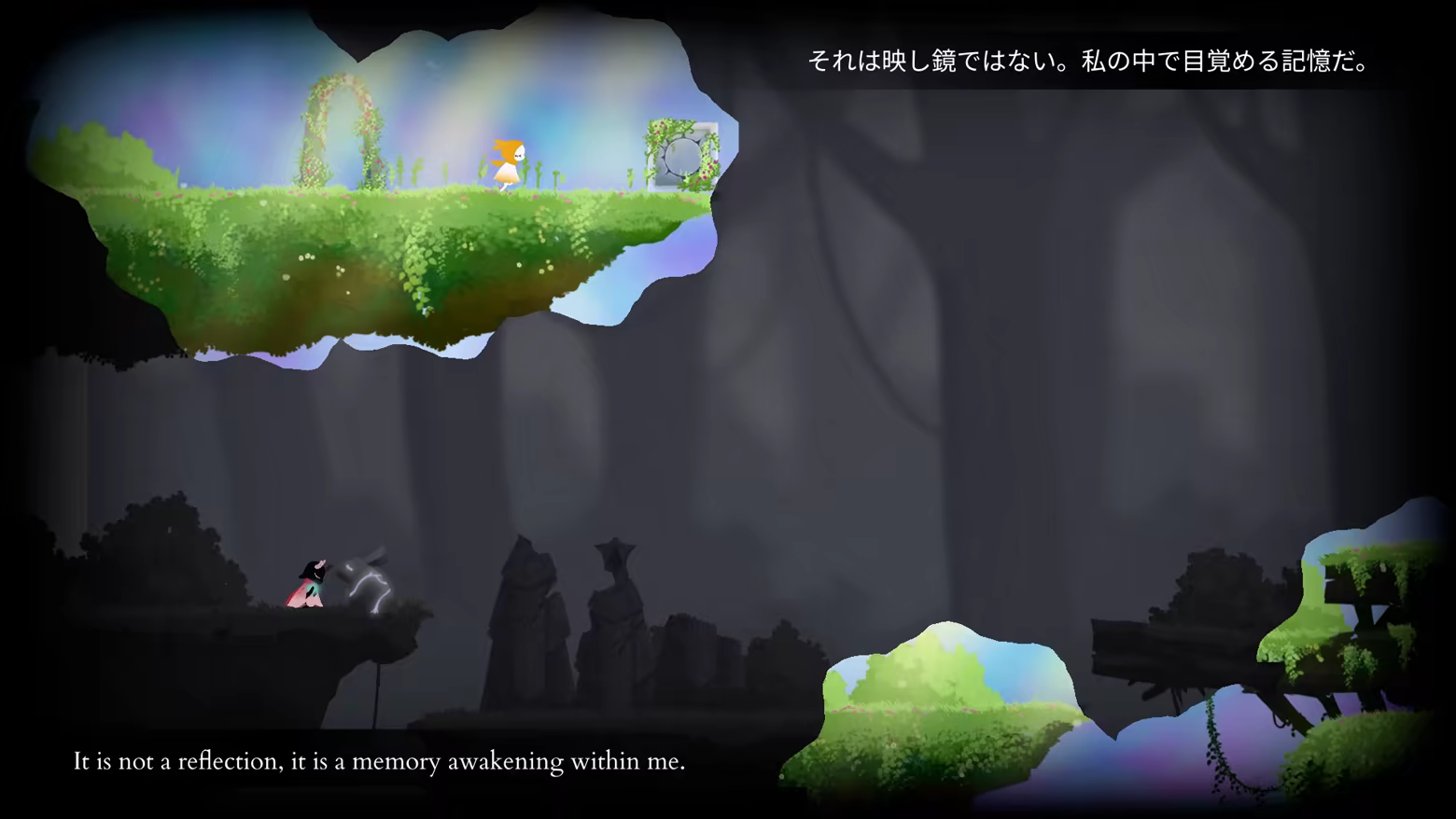 Aura is a puzzle platforming game without combat. The journey of a witch contemplating her past has big dark moments of conflict, but none are resolved through violence. Your biggest tool is connecting with your past self to change the environment and even yourself, sometimes you need to take one step back before going forward.