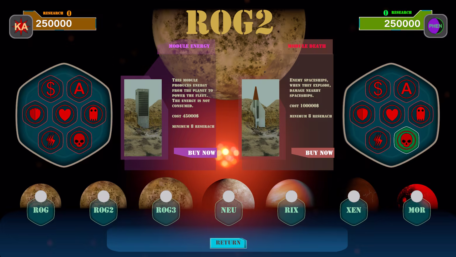 There are 5 fleets for each player to play with, each of these has different properties, speed, energy consumption, etc.. The goal is to destroy the opponent's mothership on each planet of the solar system, conquered all the planets, the player wins the tournament.
