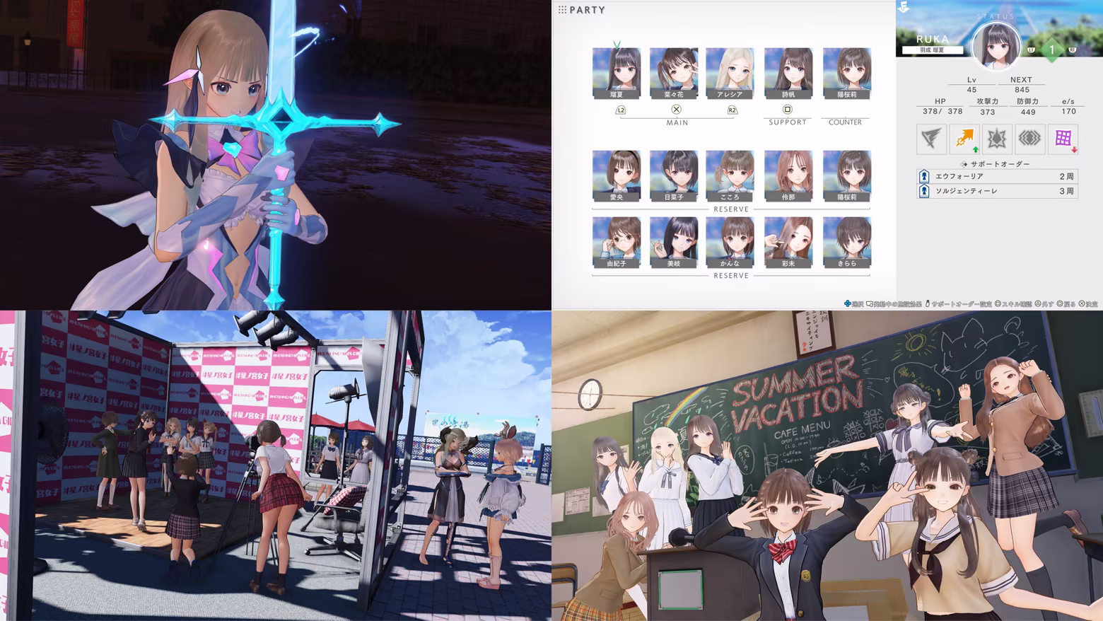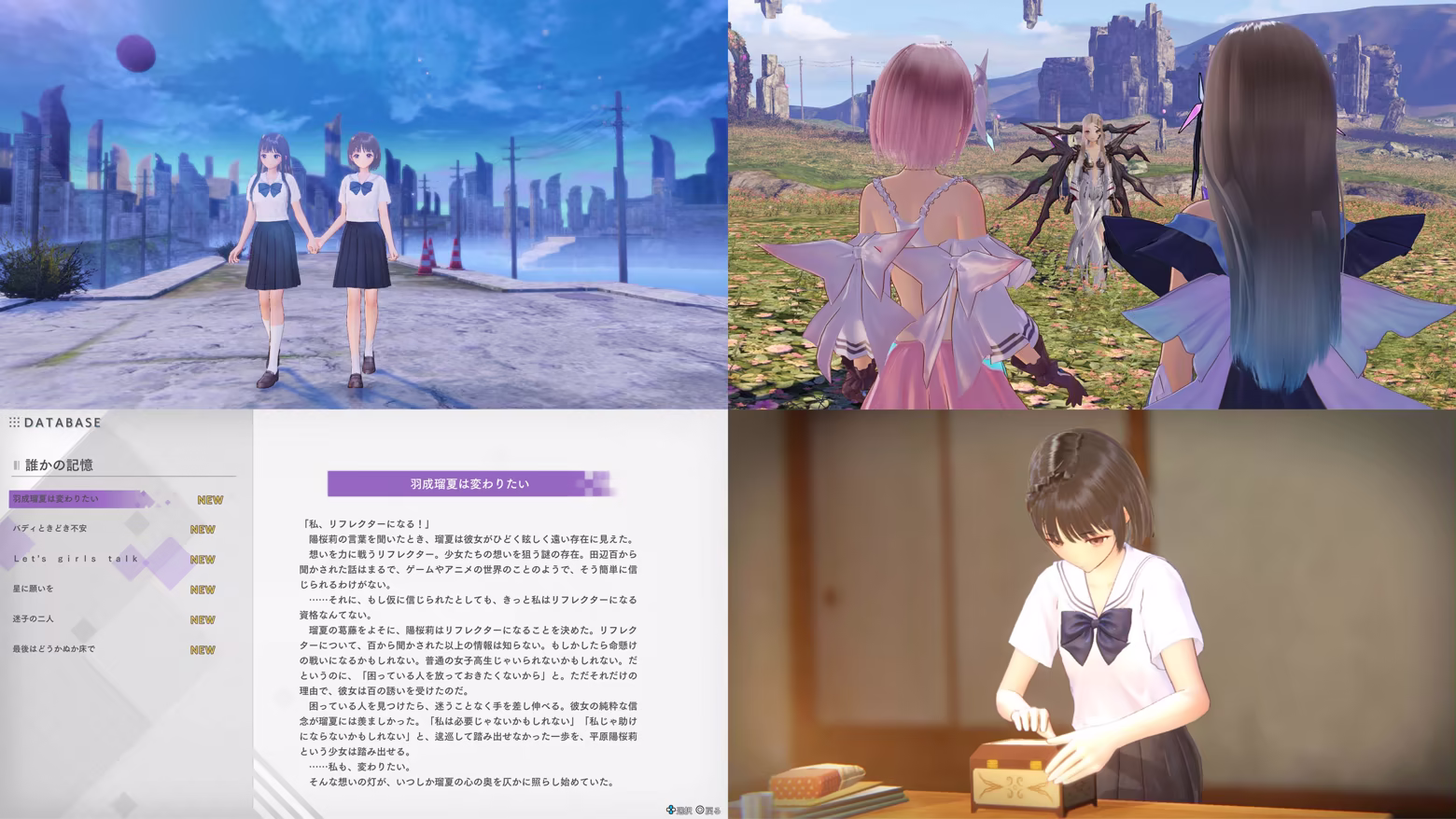 SUN's story has been remade as a console game in BLUE REFLECTION Quartet, using the systems of BLUE REFLECTION: Second Light to recreate the memorable battles of the original game. This game tells the story of SUN across 24 events featuring new character interactions. The prologue and epilogue from the original release also connect this entry to the other works in the series.