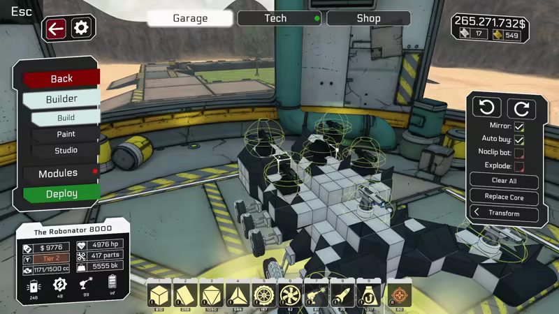 You will have to be creative and clever when designing your bots. Movement parts such as wheels, wings and hover blades need to be built with redundancy in mind, as parts can get shot off during the course of a battle. Bots may be built block by block, but will be stronger, and more intricate, when you use advanced build plates. Each bot is centered on a core which has limited HP and must be protected. Any part that is disconnected from the core will be lost instantly, so multiple strong connections are needed for an optimal design.