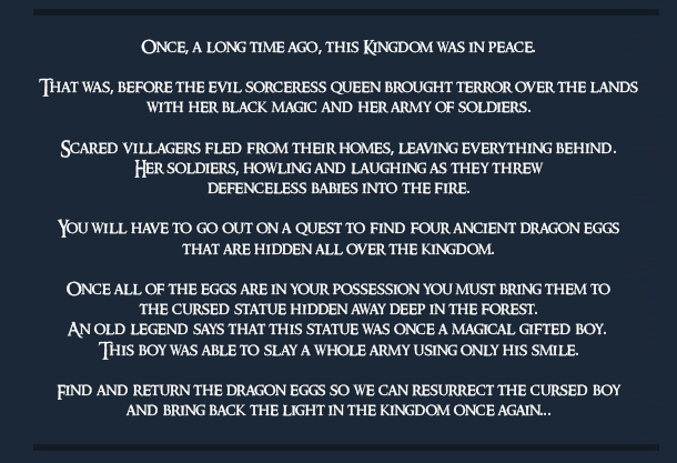 You play as an anti hero warrior, one of the very few who is willing to take on a dangerous quest to search for the 4 missing magical dragon eggs that are hidden across the kingdom of Wigglewood, discover the large map of the kingdom, visit taverns, buy and sell your items at the market,Exchange your precious pink stones for XP at the tower of the mighty wizard,earn gold at the jousting arena and fight silly enemies and avoid soulcrushing traps, defeat the soldiers of the evil sorceress queen and bring back the eggs to the hidden statue in the forest of Wigglewood so you can lift the curseof the champion child who can bring back the light in the kingdom once again.
