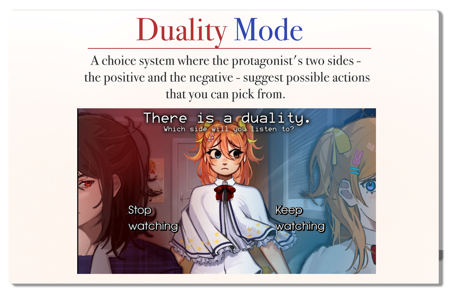 A choice system where the protagonist's two sides - the positive and the negative - suggest possible actions that you can pick from.