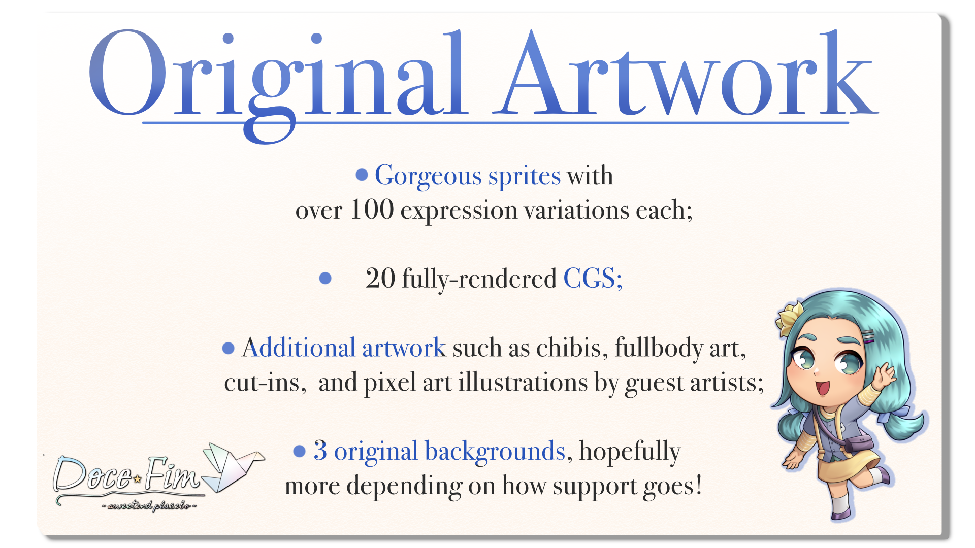 • Additional artwork such as chibis, fullbody art, cut-ins, and pixel art illustrations by guest artists;