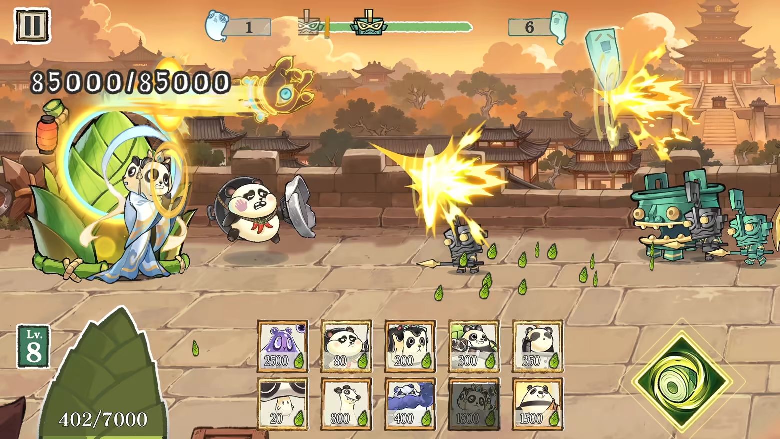 Each chapter unfolds as a sprawling landscape scroll. Complete stages to recruit new panda companions and earn bountiful Bamboo Shoot rewards.