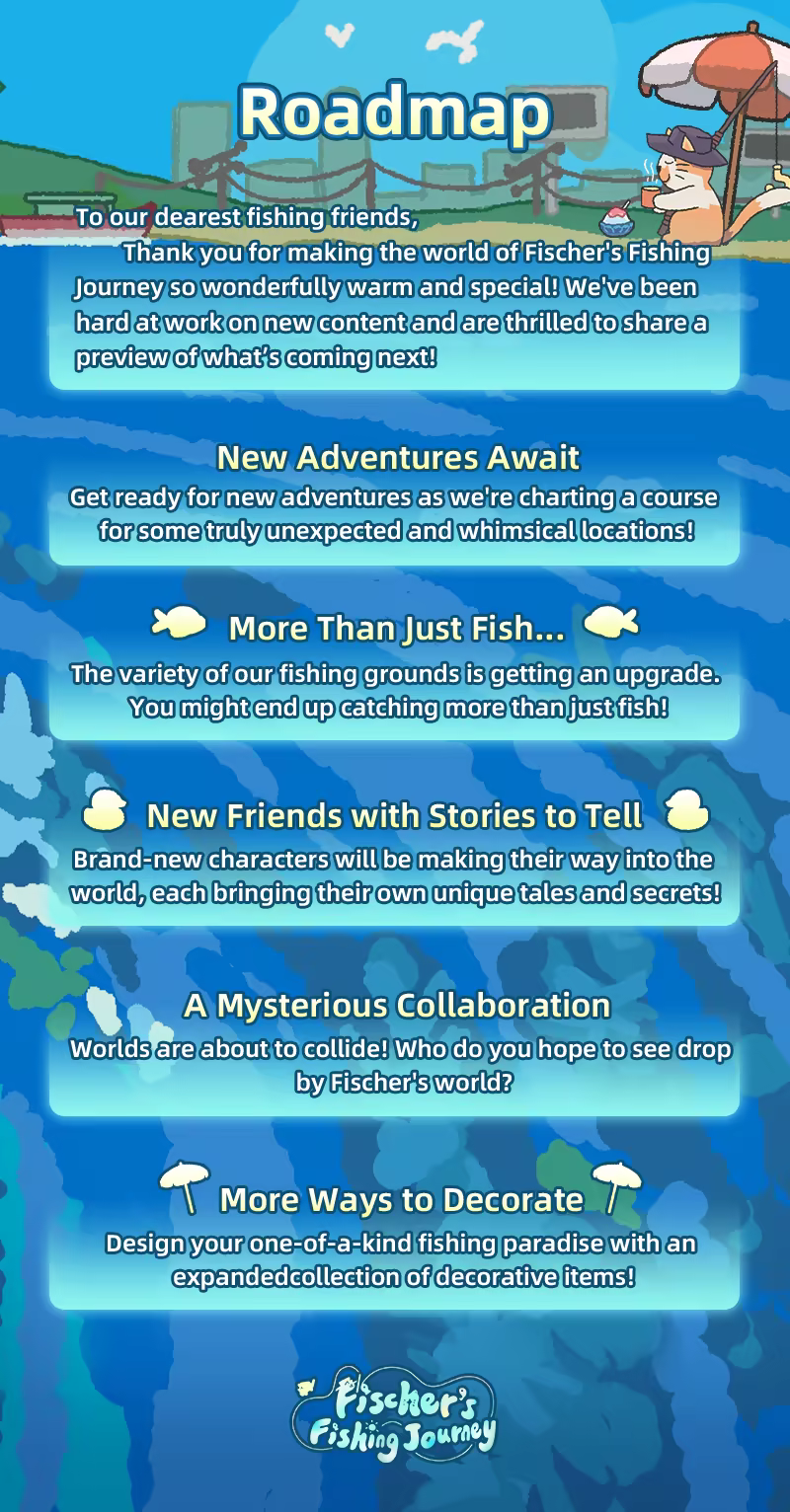 Forget complicated controls—Fischer handles all the fishing fuss for you! Just check your bait and fish basket during your downtime and relish the laid-back fun of fishing. Your catches can be sold or kept in your tank to earn Fish Coins, which let you buy more bait, upgrade your rod, expand your tank, and unlock a host of unique fish and fresh fishing spots!