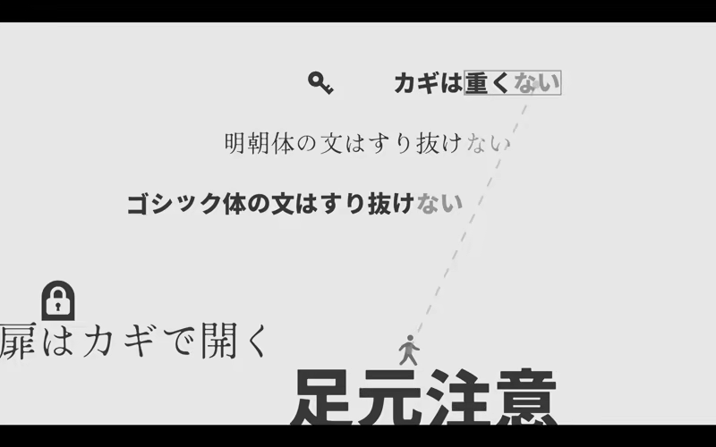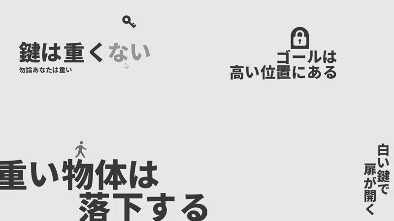 'No door can Not be opened with a Non-black key' is a rule-modifying 2D action puzzle game in which the protagonist, who has the power to manipulate the word ‘Nai(no/non/not)’, adventures through a world created by rule sentences.