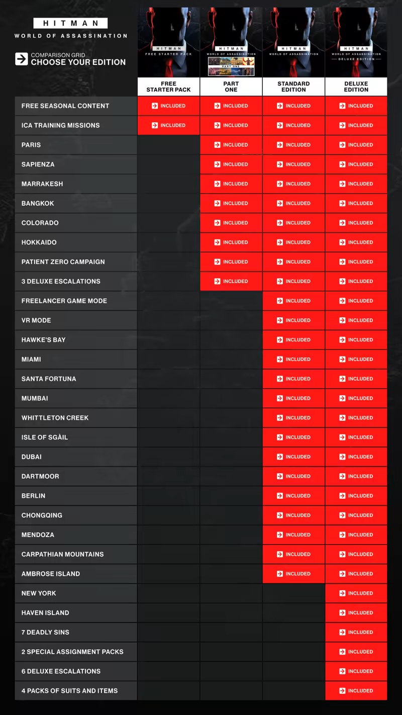 - HITMAN GOTY Edition content: Patient Zero Bonus campaign, 3 Themed Escalation Contracts with Outfits and Weapon rewards