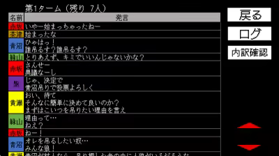 Players proceed with the story by looking at the arguments of the participants and selecting the people to be eliminated and the reasons for doing so.