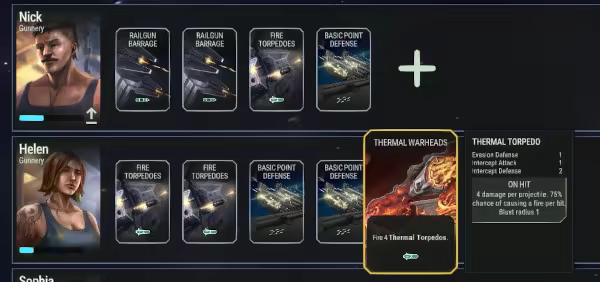 Unlike most deckbuilders where you have a global deck of cards, in Hunt of the Reptorians each crewmember contributes cards to the overall deck. As they gain experience, they will get more cards. Or you will be able to upgrade or remove their existing cards. You’ll have to make sure you protect and nurture them with training etc. It won’t be a good day when your highly experienced pilot is sucked out into space!
