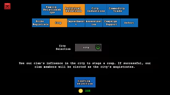 Family: Rise is a pixel-art strategy simulation game where you start with a family of one and grow your clan's influence across the city through procreation, establishing various industries, making wise decisions in critical situations, and engaging in strategic alliances with other families. Your ultimate goal is to become the most powerful and influential family in the city.