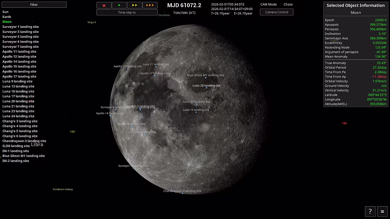 Furthermore, the motion of each celestial body is precisely simulated using Kepler's laws.