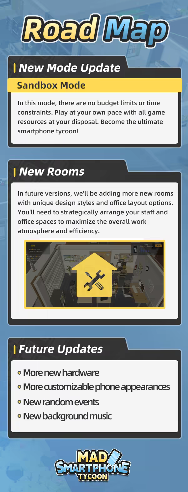 Mad Smartphone Tycoon is the second game I have made. I will keep on updating in the future. I am more than pleased to have your support and feedback. Please join our official Discord at to share your idea and help improve the game. Thank you!