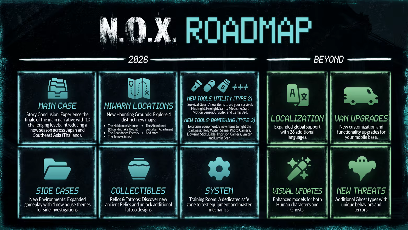N.O.X. puts you in the role of a supernatural investigator. Alone or with friends, you’ll search for clues, identify the spirit, and carry out the ritual needed to send it back. The game is built around replayability, with randomised maps, shifting conditions, and entities that never behave the same way twice.