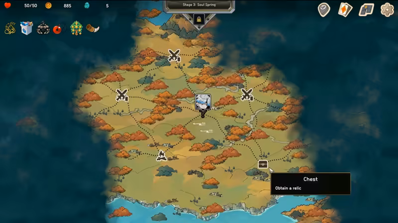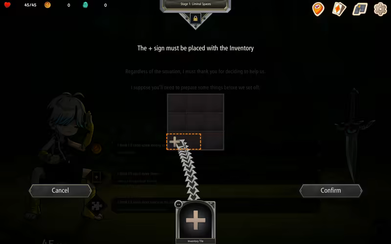 In this "inventory" roguelike deck-building game, each card's ability is influenced by its position in the inventory, the surrounding situation, and relics.
