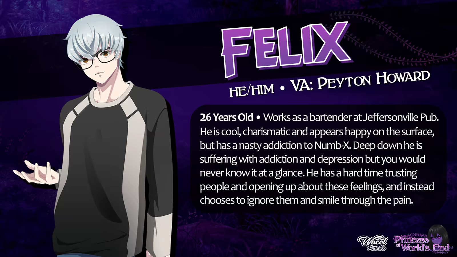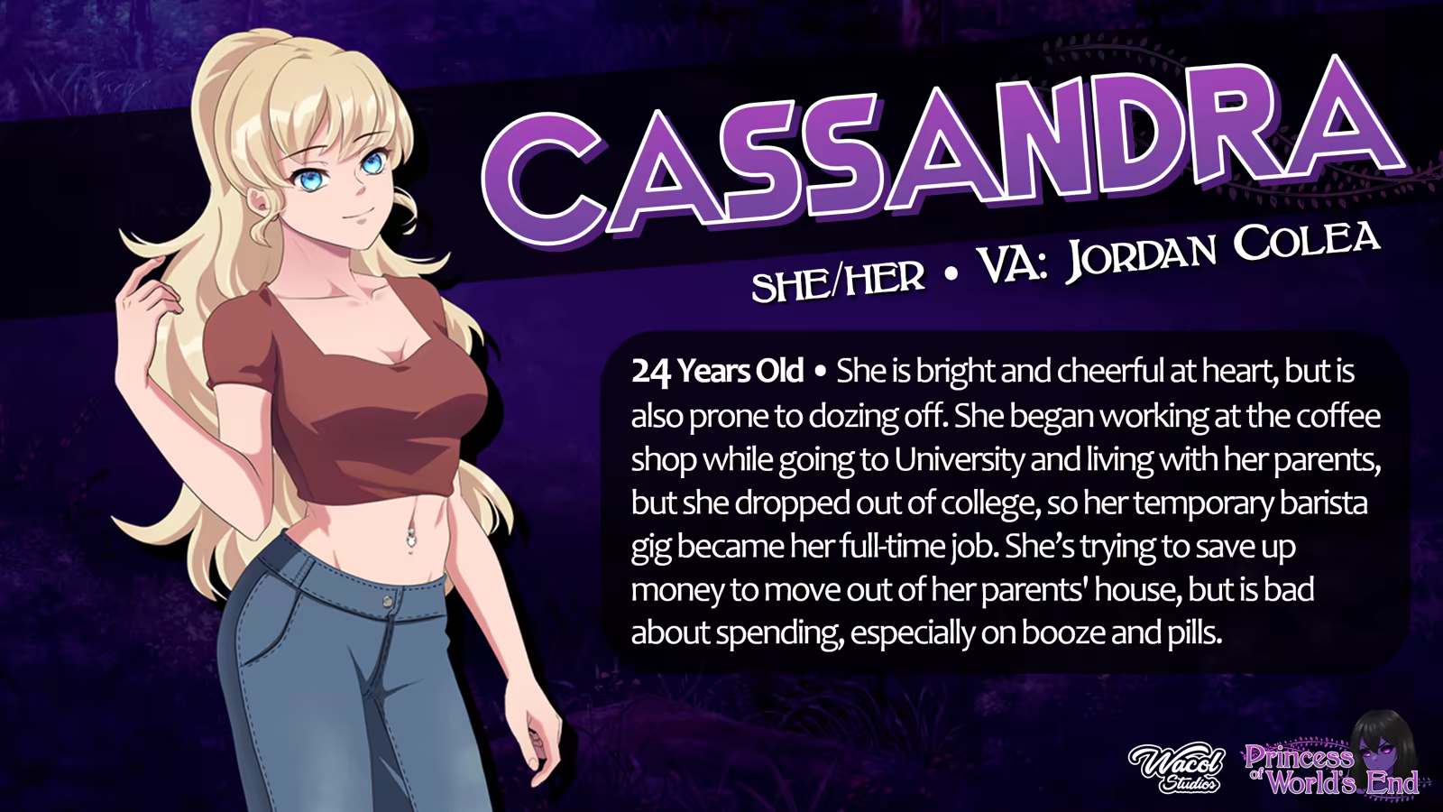 Play as Princess (voiced by ShadowgamingVA), a high-maintenance 21-year-old girl who earned the nickname through her bratty behavior. After running away from home at 16, she worked dead-end job after dead-end job in order to survive and manage her addiction to a pain pill called Numb-X. The story begins with her waking up in a forest late at night during a rainstorm after getting knocked unconscious and robbed of all her belongings. Through a strange series of events, she unlocks a new power that will change her life forever. You will help guide Princess to get her life together, manage her relationships and, most importantly, prevent the end of the world.