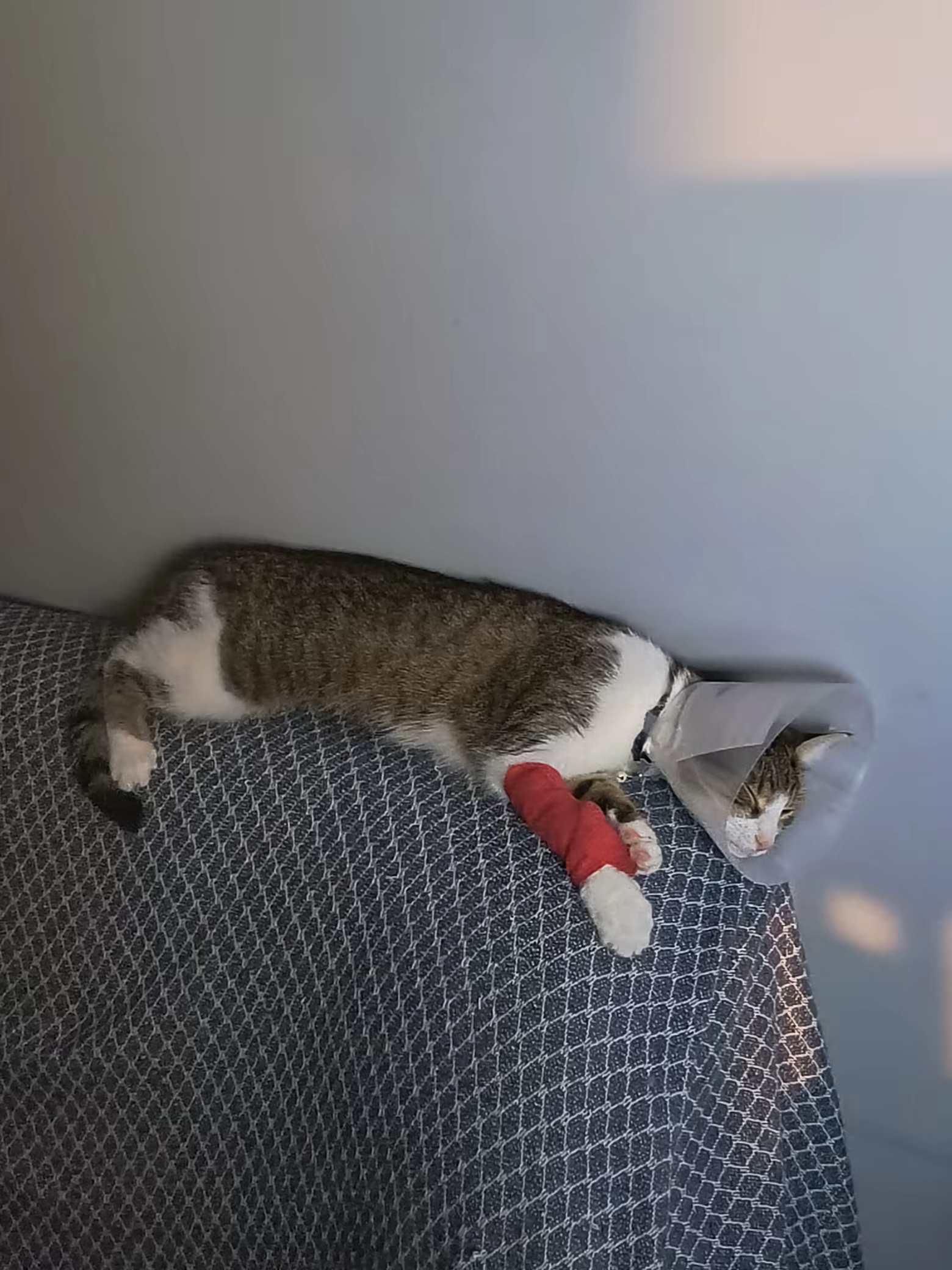 This game was inspired by my real cat, Petra, who survived an accident. Here she is during recovery. Her fight to get better inspired Rogum's journey through a dream world of challenges and hope