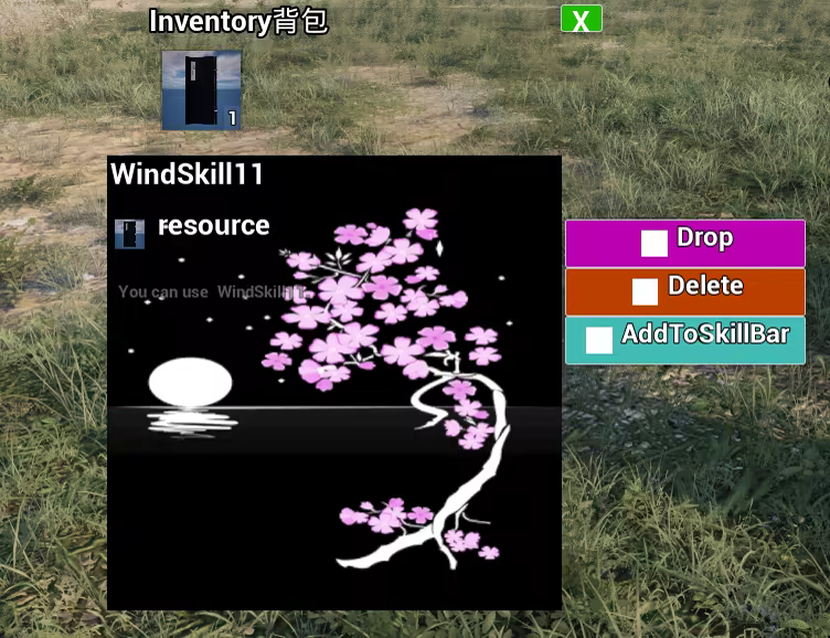 and Press"B" to open inventory,and Press"Add to SkillBar" in inventory.