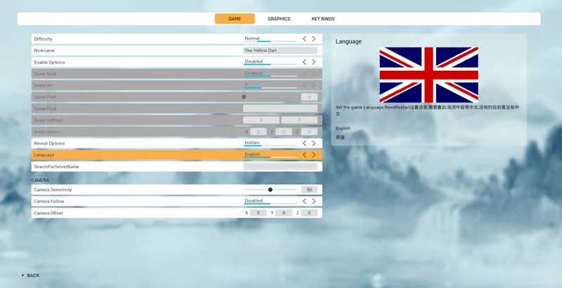 (Chinese中文) 开始-(选择个文档,双击)-完成-选项-language-换其他的语言-save-重启游戏。