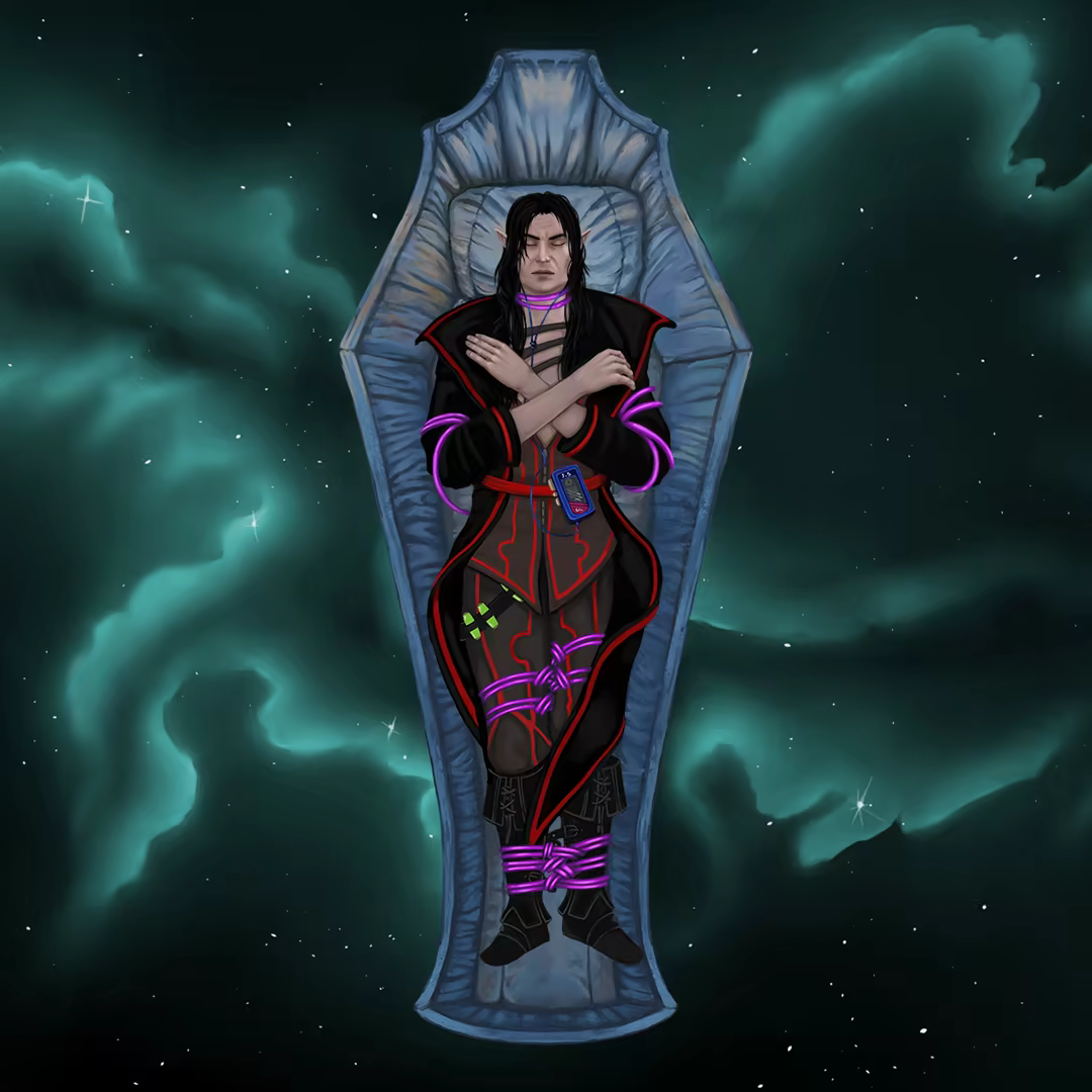 The first playable character is Vleed Sângerel, a vampire socially unadjusted for spatial travel. He has been yeeted off his homeland for biting the wrong butt at the wrong time and now he has to pretend to be normal because It's just easier for the common folk to understand.