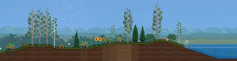 The ground is fully dynamic; sculpt it as you like. Raise mountains, carve out lakes, even flood the land to form oceans. Drain the water to create deserts, or let it rise and watch valleys turn to swamps. Every change you make shapes how nature thrives.