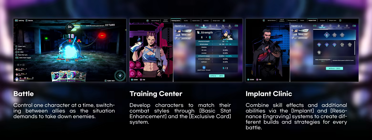 Develop characters to match their combat styles through [Basic Stat Enhancement] and the [Exclusive Card] system.