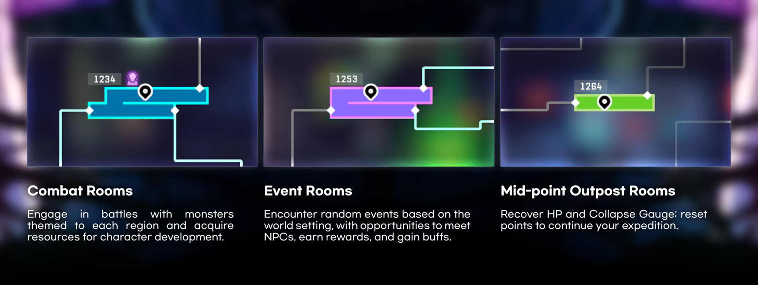 Event Rooms: Encounter random events based on the world's lore, with opportunities to meet NPCs, earn rewards, and gain buffs.