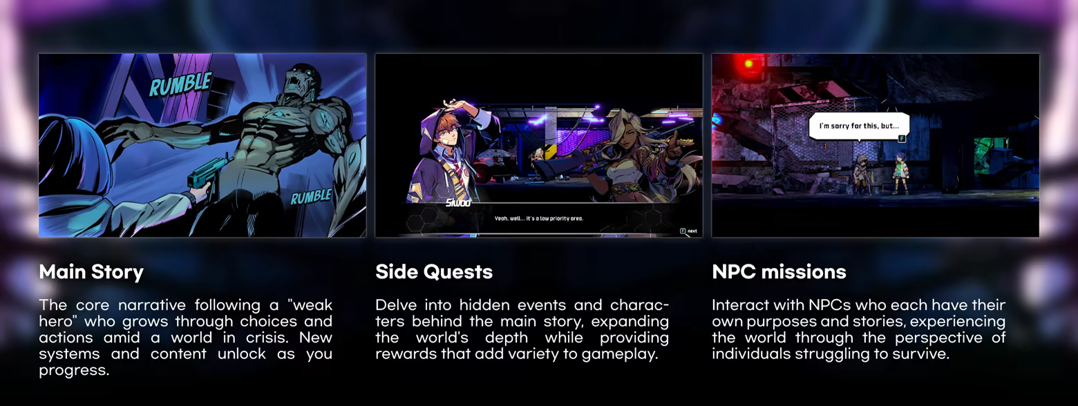 Main Story: The core narrative of growth through choices and actions amid a world in crisis. New systems and content unlock as you progress.