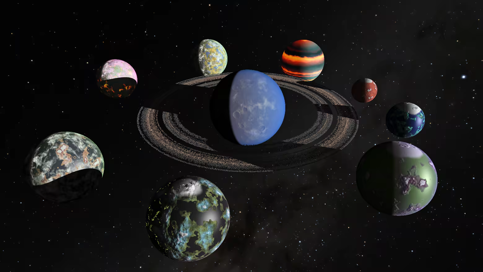 The application has a number of object types - planets, stars, asteroids, disks, clouds, galaxies, and more. Each object has adjustable parameters that allow you to change its geometry, materials, appearance, and simulation behavior. The surface textures of planets and asteroids can be further tailored using procedural generation or by uploading custom images.