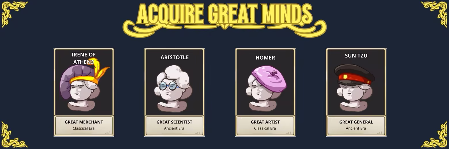 When your civilization reaches a cultural peak, history’s greatest icons emerge to offer their expertise. Spend your Culture resources to draft legendary figures like Sun Tzu, Aristotle, or Homer for immediate, high-impact interventions.