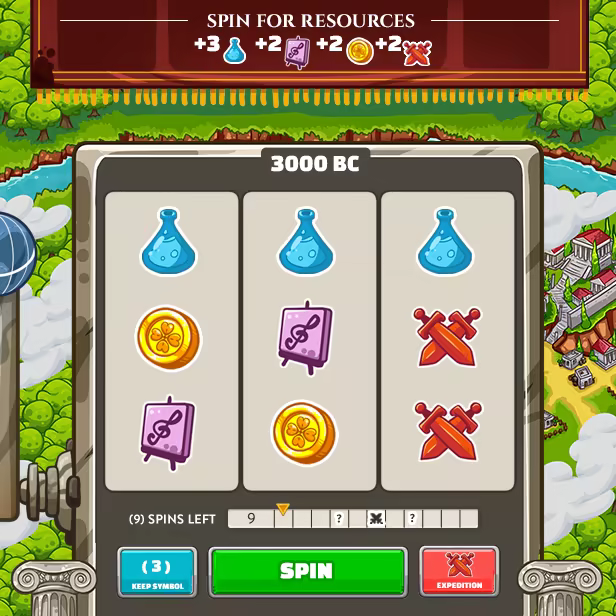 In order to beat your era score and survive through time, spin the slot machine, get resources, and combine spin results with the technologies you have discovered. Uncover new technologies, find out great persons, construct amazing wonders, and build your deck through turns. Uncover all hidden leaders and decks as you progress. You’re going to need every edge you can get in order to reach the next era for your people and to secure victory!