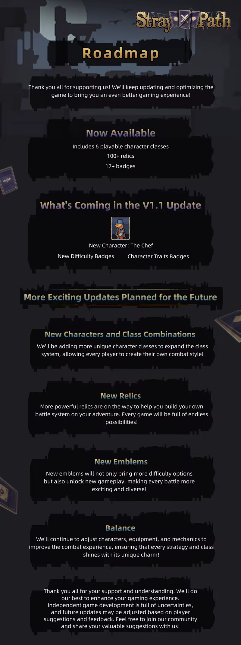 Stray Path is a roguelike card game brimming with endless possibilities. Each run, select from a variety of adventurers and take on the challenges of a randomly generated stray world. Optimize every choice: whether to keep or discard skill cards and item cards is entirely up to you. Drag cards like you would in FreeCell, and even store two cards in your inventory. Come along on a thrilling journey of card-flipping that will keep you engaged until you reach the end of this stray world!