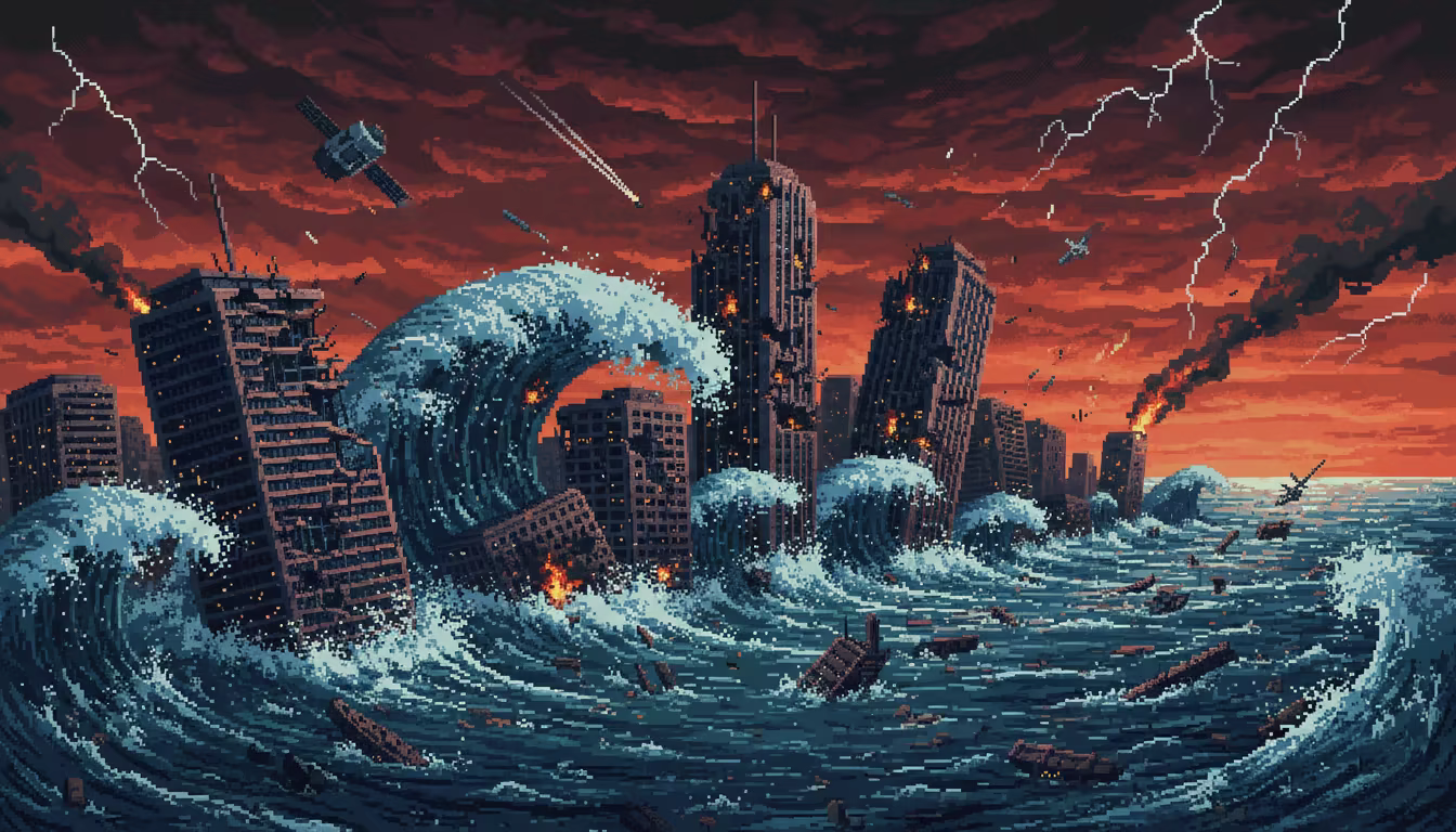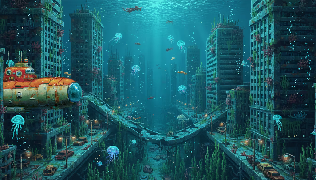 A massive failure in legacy systems caused the collapse of the planet, leaving it completely submerged. Humanity survives in patched-up submarines, sunken cities, and technology that still works… out of sheer stubbornness.
