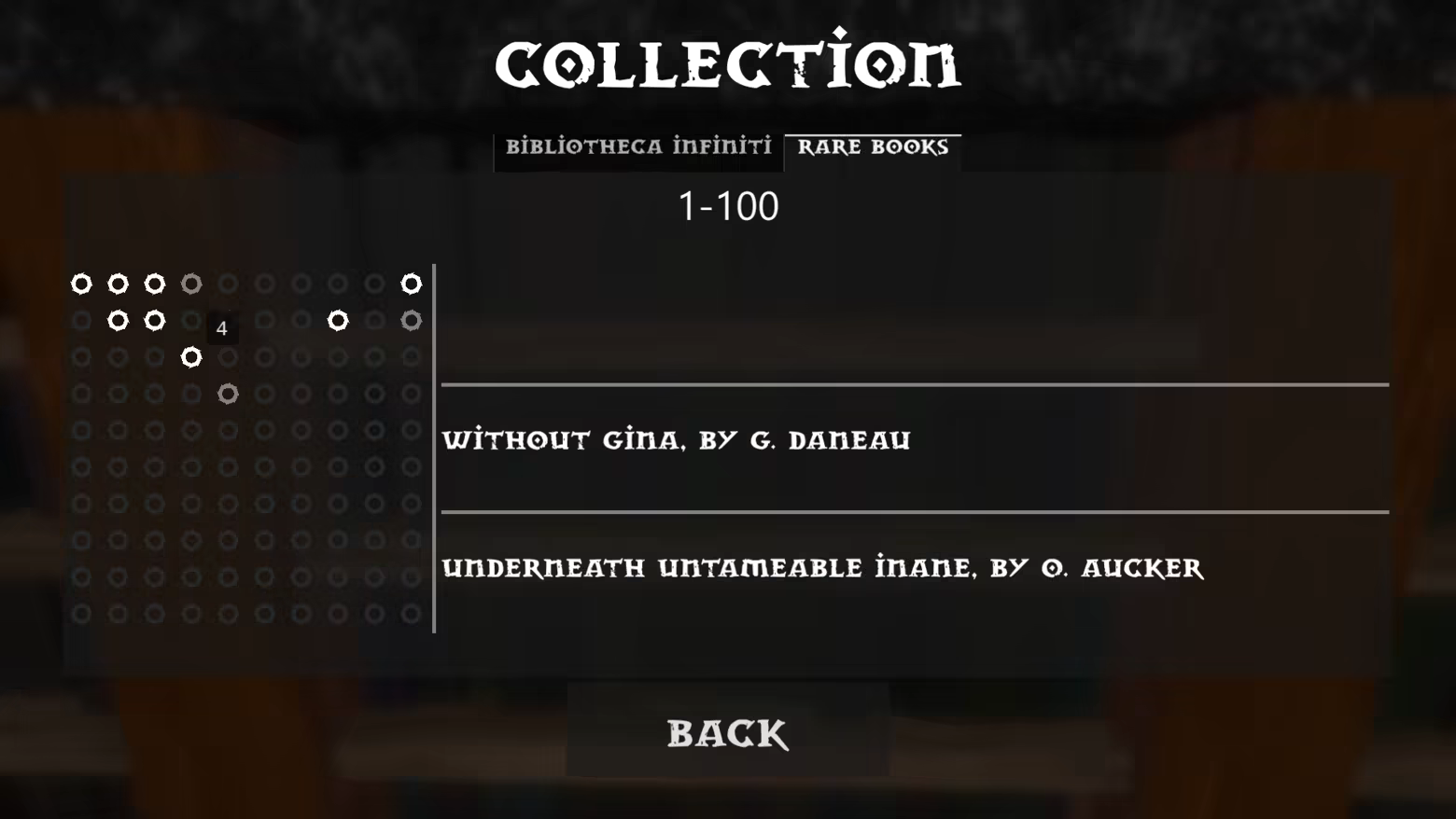 (NOTE: Book titles and authors are procedurally generated; any resemblance to actual books or authors is purely coincidental. While steps have been taken to reduce the chance of generating 'inappropriate' or 'offensive' titles, their generation may still be possible; should such titles be generated, please understand that they are neither intentional nor malicious in nature. If any offensive or inappropriate titles are discovered, please report their Chamber number for review so they can be altered in a future update. Thanks!)