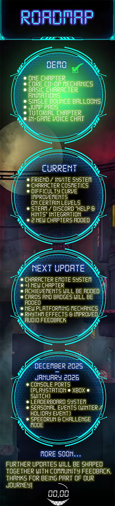 In Ticking Together, you take on the role of one of four elite bomb defuse team in a stylish cyberpunk world teetering on the edge of annihilation. Somewhere beneath the neon haze and mechanical chaos lies a bomb powerful enough to level the entire city—and you're the unlucky team assigned to deliver it across a series of deadly obstacle courses.