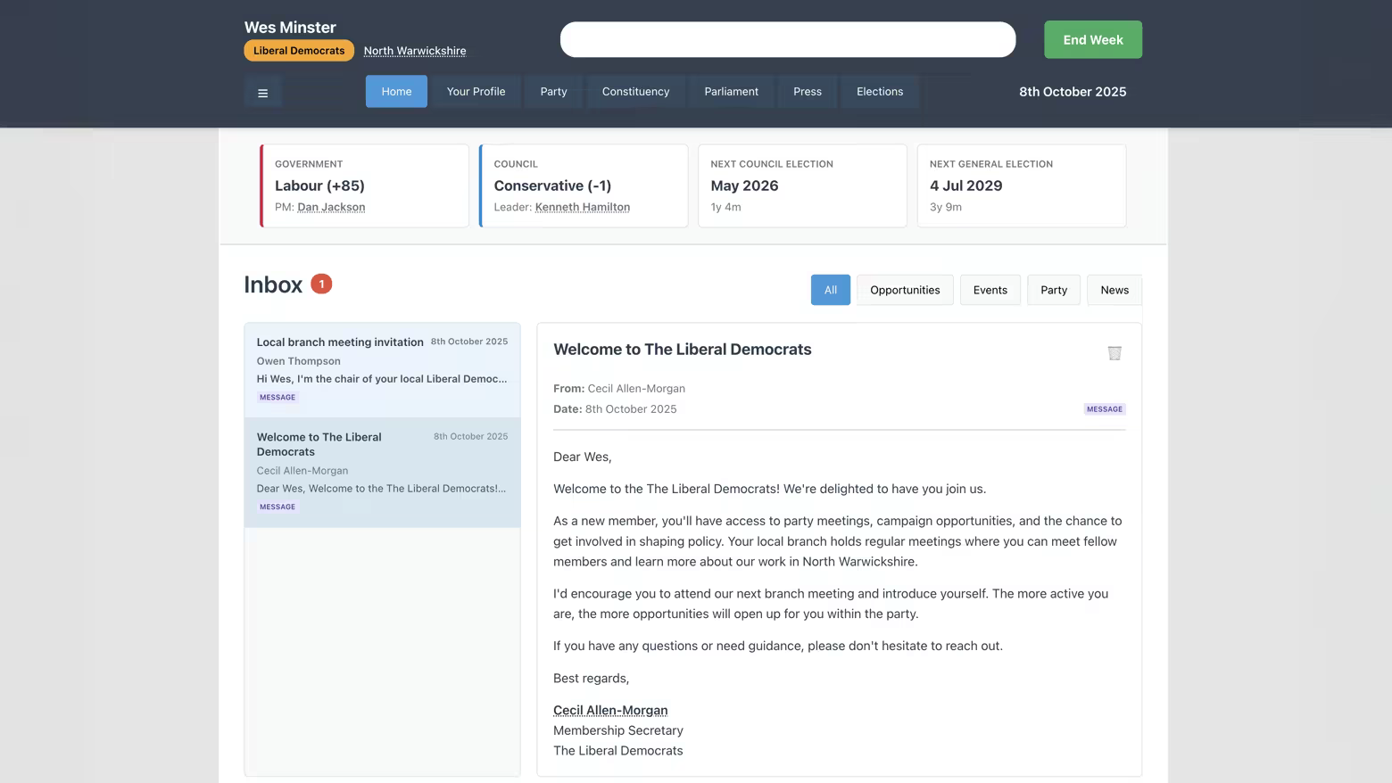 Start as a local councillor. Build your reputation. Climb to Westminster. The simulation responds to what you do, not what the script says should happen.