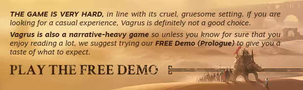 Vagrus is an award-winning roleplaying game with a narrative focus, open-world exploration, and strong elements of strategy. The player takes the role of a vagrus - a caravan leader who strives to survive in a strange and perilous dark fantasy world by leading a traveling company on all kinds of ventures.