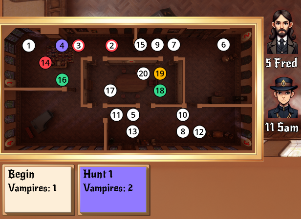 Each round consists of two movement turns and one hunting turn—but the vampire moves first. Watch their actions carefully, tag characters as suspects, confirmed threats, or mortals, and strike in your hunting turn!