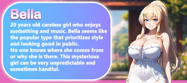 Outside in the park you will meet Bella, one of the popular girls. She's a cheerful type that likes beautiful things. Choosing the right things to say may charm her enough and get you two on a date.