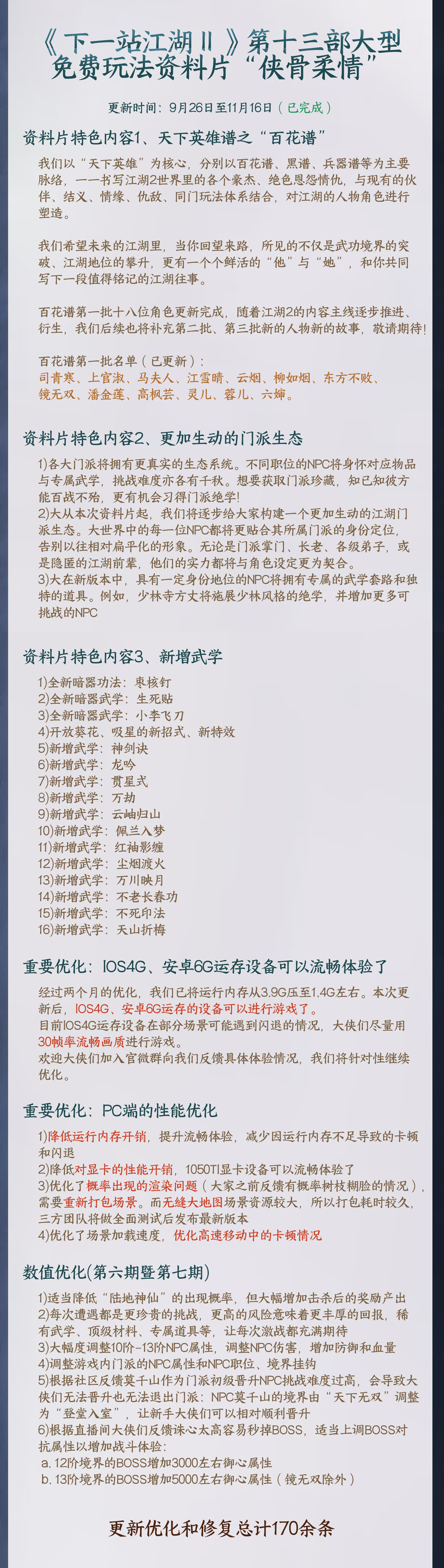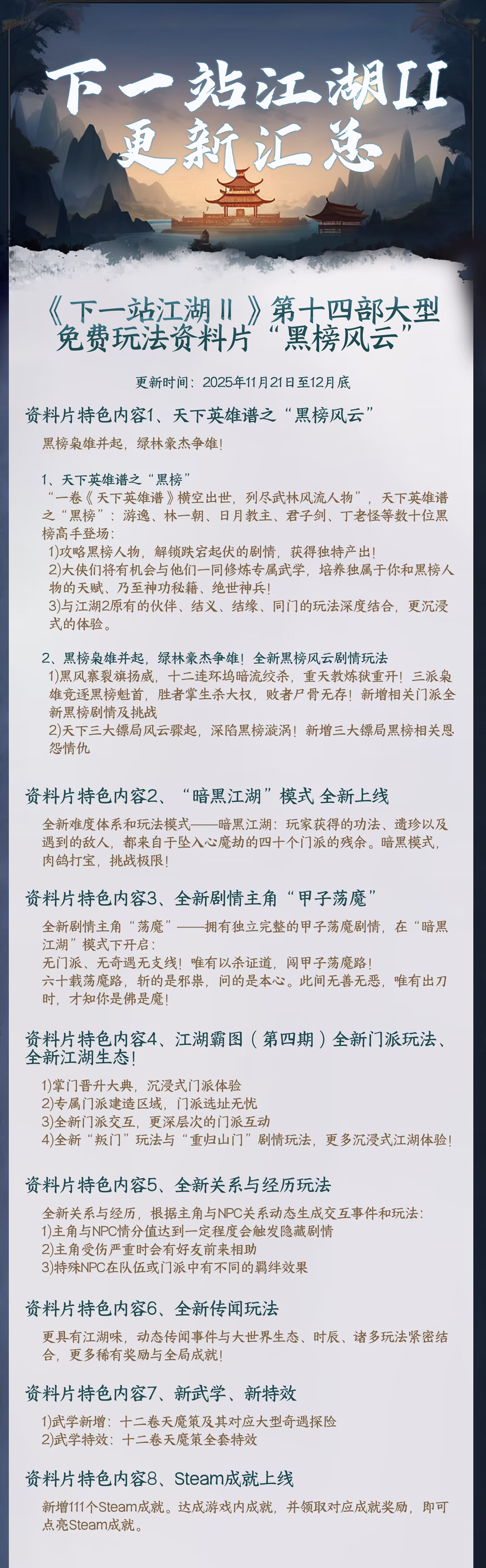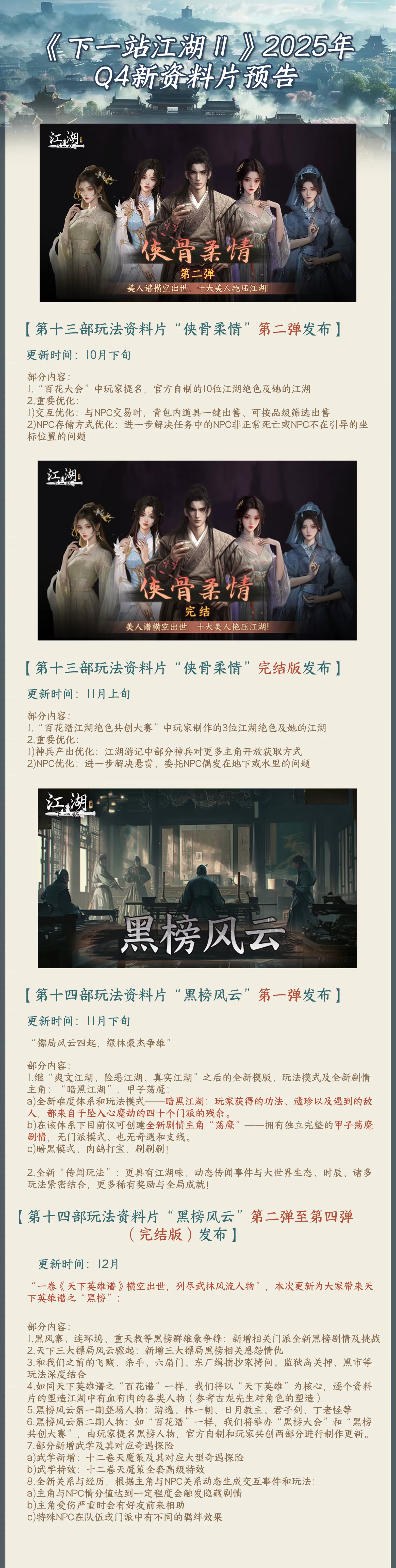 庞大内容、及时更新:上线迄今已超过百更、八部大型玩法资料片!2025年我们将继续砥砺前行,用更多更好玩的内容来填充这个江湖大世界!