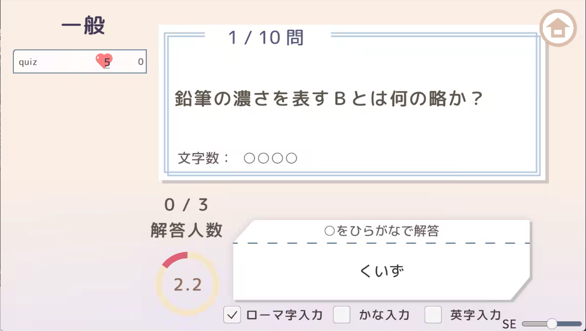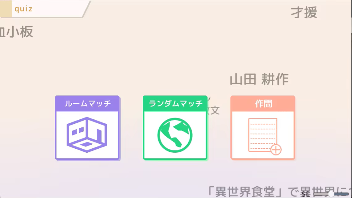 出題されるクイズを、4択またはタイピングから解答方法を選んで解答しよう。どちらの解答方法を選んでも、対戦相手は全員同じ解答方法での対戦!二つのマッチング方法があるので好きなほうで参加しよう!