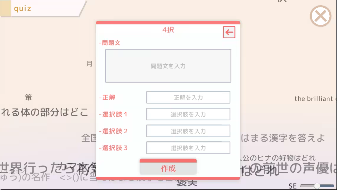 4択、タイピングそれぞれ自分で問題を作ることが可能!作った問題はルームマッチで使うことができるので、たくさんの問題を作っていろんな人と対戦しよう。