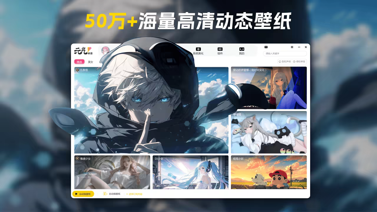 元气桌面壁纸是一款免费优质的桌面壁纸和美化软件,50万+张超清无水印动静态壁纸,更有特色鼠标、任务栏美化等实用功能美化你的桌面。 内置桌面整理功能:智能识别文件,一键分类整理,还你清爽桌面;独立研发桌面壁纸渲染引擎,真实还原雨雪光特效和各种粒子效果,让静态壁纸动起来,效果栩栩如真,为你打造电脑桌面的绝美盛宴。
